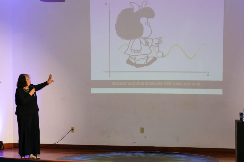 Eda Tassara falou terça, dia 23, sobre “Ambientalismo, poder e conhecimento: globalização da informação e geopolitização do imaginário por mundos possíveis”, no auditório da reitoria da UFSC. Foto de Marcos D’Elboux.