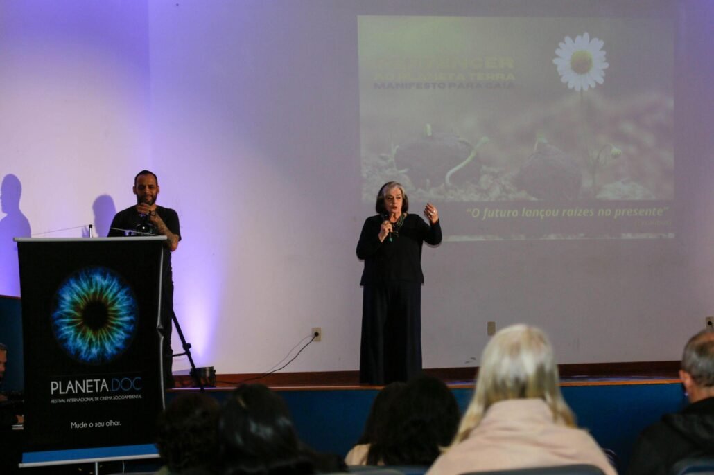 Vários nomes se apresentaram nesta terça, dia 23, no Planeta.doc Conferência. Entre os palestrantes do dia estiveram Kerexu Yxapyry, liderança indígena internacional, coordenadora executiva da Articulação dos Povos Indígenas do Brasil (APIB) e cofundadora da Articulação Nacional das Mulheres Indígenas Guerreiras da Ancestralidade (ANMIGA). Ela abriu o segundo dia de conferência e falou sobre “Crise climática, a resposta somos nós”. Kerexu ressaltou a necessidade de reflorestar mentes para buscar a consciência das pessoas sobre o planeta. Defendeu, também, que a sociedade precisa considerar o ponto de vista e a experiência dos indígenas com a natureza. Para isso, Kerexu explica que é preciso “aldear” a política para que se entenda e respeite o modo de vida e a organização dos povos indígenas. Ela aposta no envolvimento das pessoas com o meio ambiente para que gere afeto. “Todo envolvimento gera afeto. Todo afeto gera cuidado”, explicou.